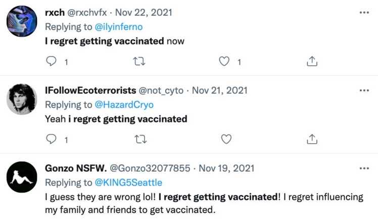 Replying to KING5 Seattle, one user wrote they regretted getting vaccinated and regretted “influencing my family and friends to get vaccinated.”