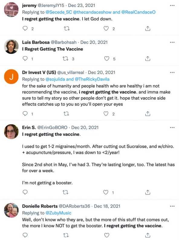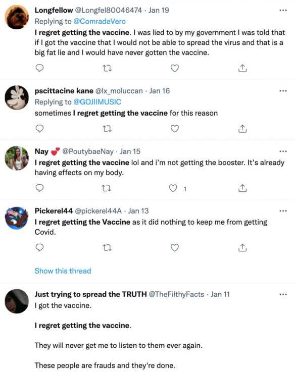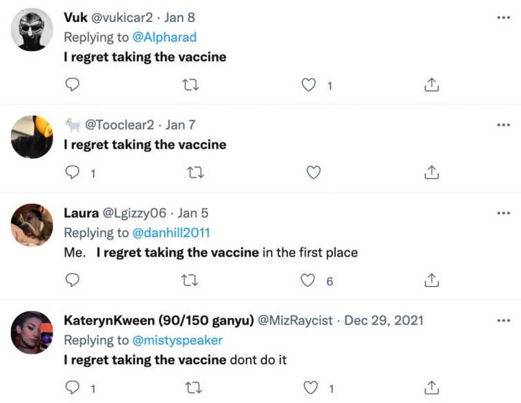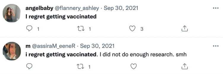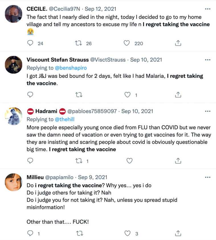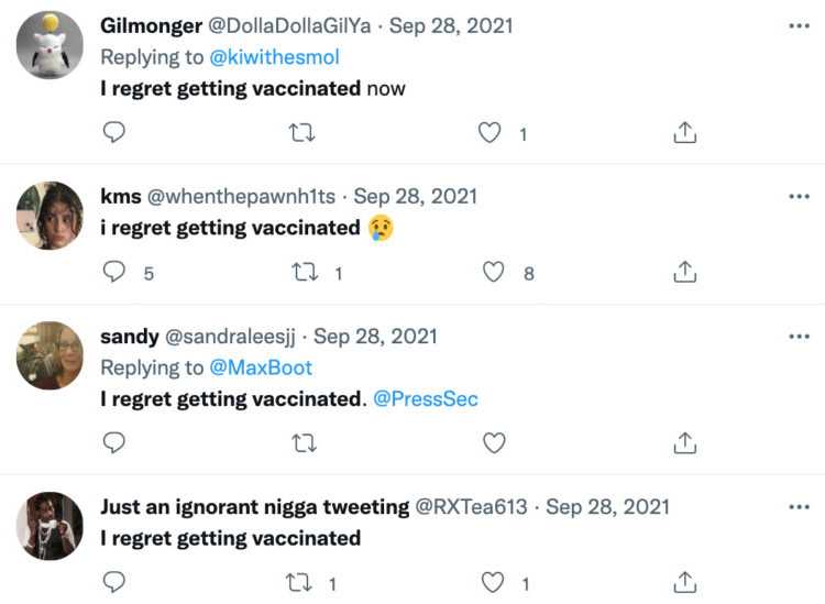 “I regret getting vaccinated. I did not do enough research. smh,” tweeted one clearly remorseful woman.