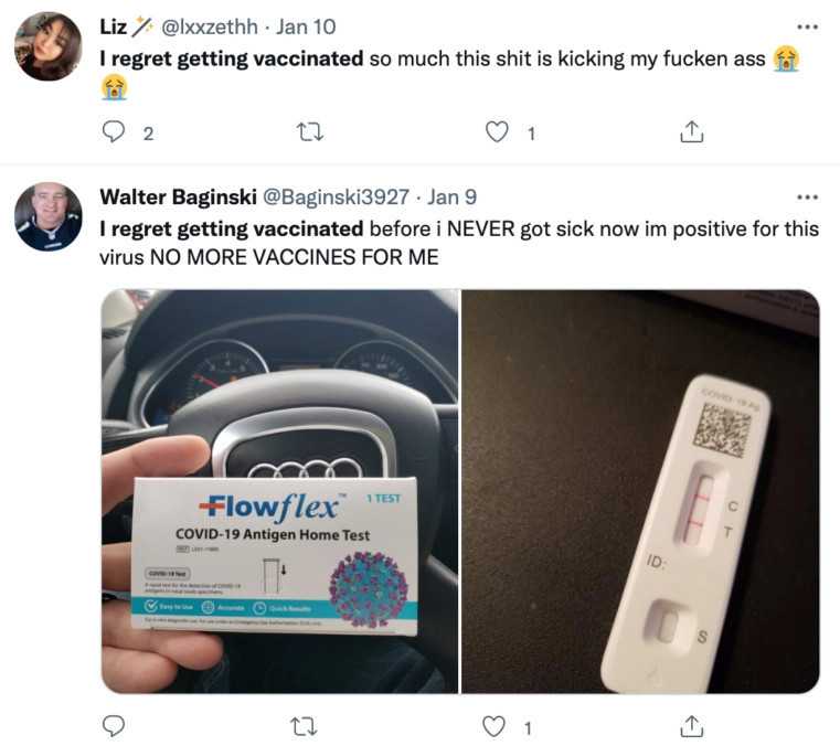 “I regret getting vaccinated. Before I NEVER got sick. Now I’m positive for this virus. NO MORE VACCINES FOR ME,” another person wrote, attaching photos of a positive Covid test.