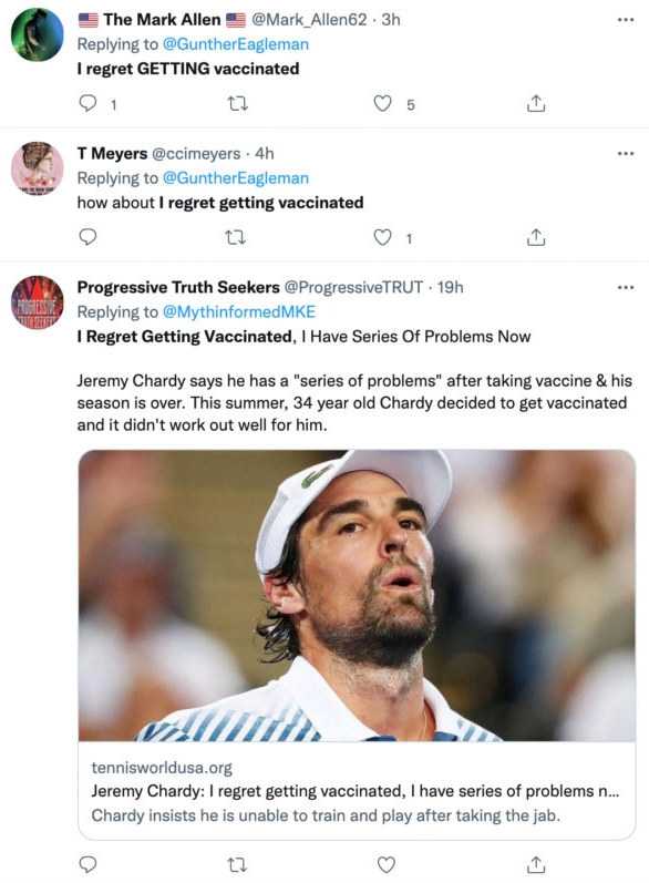 “I regret getting the vaccine,” related another Twitter user. “I was lied to by my government I was told that if I got the vaccine that I would not be able to spread the virus and that is a big fat lie and I would have never gotten the vaccine.”