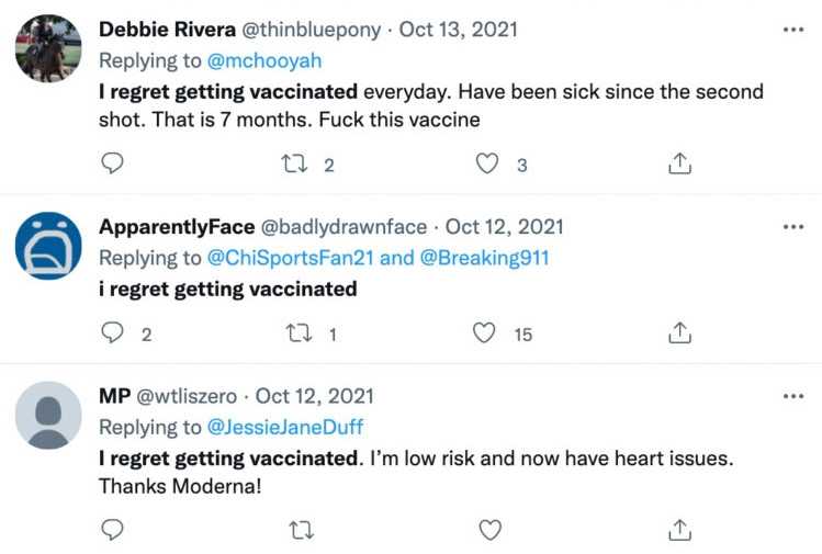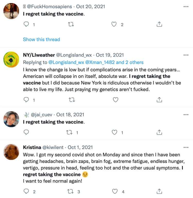 “I regret getting vaccinated,” many people tweeted toward the end of September.