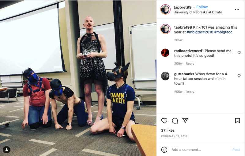 Brinton actually led a “Kink 101” session over at the University of Nebraska at Omaha. Here is a photograph of Brinton, sporting a dress, standing over three males who are kneeling while wearing leather bondage like dog masks on their heads.