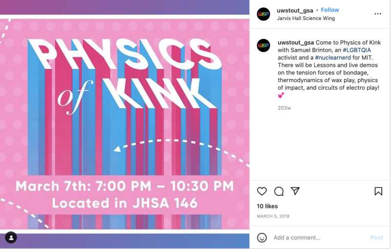 “Brinton has also lectured on kink at college campuses, including a class for the University of Wisconsin-Stout Gender and Sexuality Alliance on the ‘Physics of Kink’ on March 7th, 2018. A description on Instagram said the session was to include ‘live demos on the tension forces of bondage, thermodynamics of wax play, physics of impact, and circuits of electro play!’” the Pulse revealed in its report.