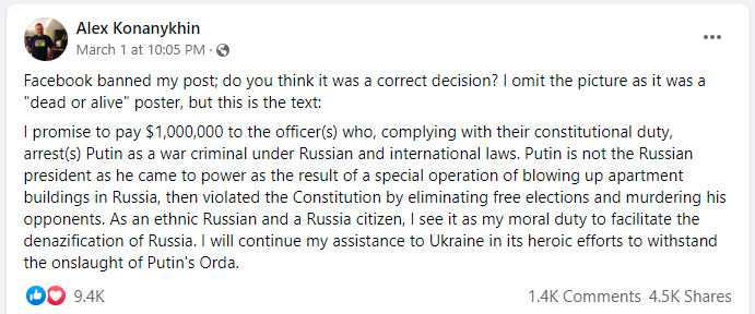 Facebook then banned his post but Konanykhin re-posted with just the text regarding his bounty offer.