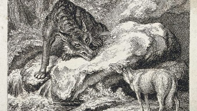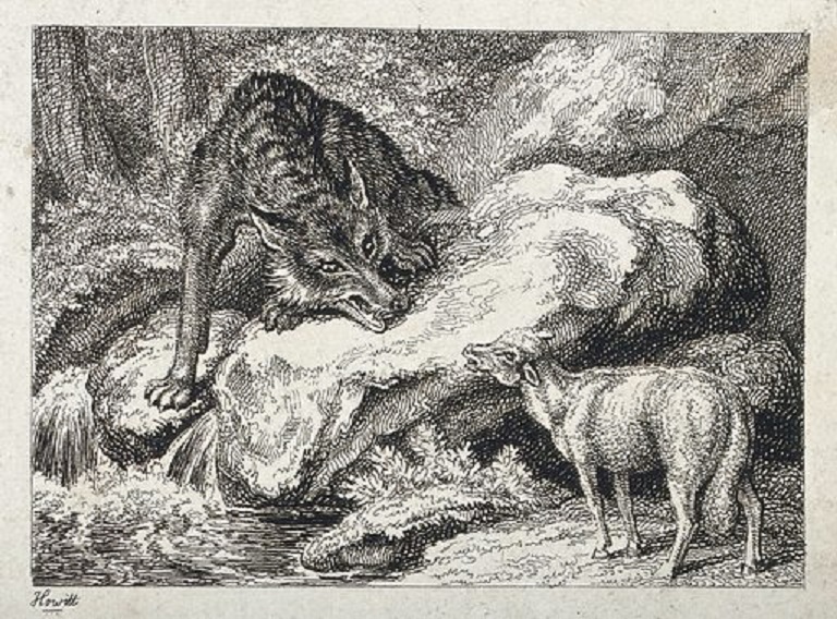 Image: https://creativecommons.org/licenses/by/4.0/; Etching by W-S Howitt. Wolves; Work ID: bgjca8g7; https://www.lookandlearn.com/history-images/YW021601V/A-large-wolf-snarling-from-across-a-stream-at-a-bleating-lamb