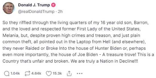 He added, “The Biden administration invaded the home of their chief political opponent who is absolutely destroying him and everyone else in the polls … on a phony pretext, getting permission from a highly political magistrate who they hand-picked late in the evening, just days before the break-in, and trampled upon my rights and civil liberties as if our country, that we love so much, were a third world nation.”