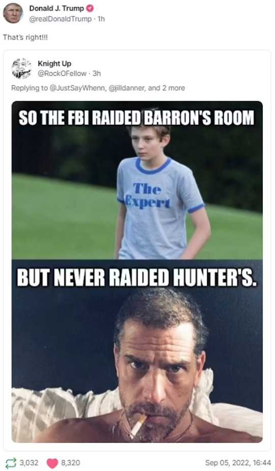 Trump then shredded the bureau by sharing a post from a user who said that the “FBI Raided Barron’s Room…But Never Raided Hunter’s.”