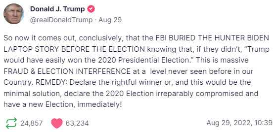 ‘FBI BURIED THE HUNTER BIDEN LAPTOP STORY BEFORE THE ELECTION knowing that, if they didn’t, ‘Trump would have easily won the 2020 Presidential Election.’ This is massive FRAUD & ELECTION INTERFERENCE at a level never seen before in our Country,’ Trump said in a post on Truth Social.’REMEDY: Declare the rightful winner or, and this would be the minimal solution, declare the 2020 Election irreparably compromised and have a new Election, immediately!’