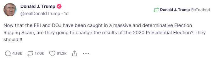‘Now that the FBI and DOJ have been caught in a massive and determinative Election Rigging Scam, are they going to change the results of the 2020 Presidential Election? They should!!!’ Trump wrote in the post, according to the Daily Mail.