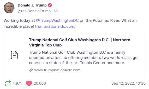 “Working today at @TrumpWashingtonDC on the Potomac River. What an incredible place!” he went on to say in a post published on his Truth Social platform Monday.