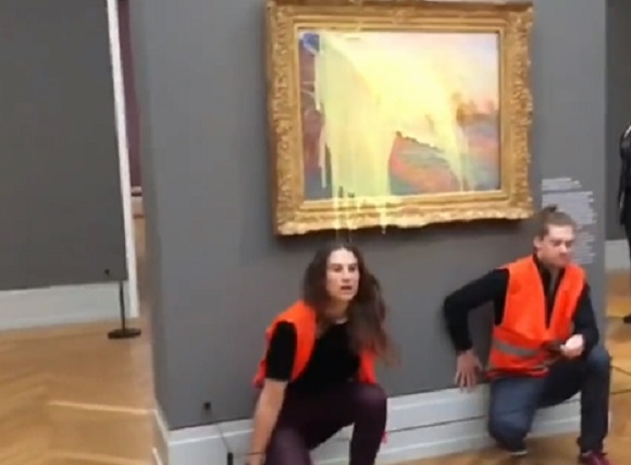 In case you haven’t heard, days ago German Police arrested a pair of “Last Generation” protesters who decided to bring attention to so-called climate change perils by throwing mashed potatoes at Claude Monet’s painting “Grainstacks” on display at Potsdam’s Barberini Museum. The video shows the duo then kneeling in front of the oil landscape and gluing their hands to the wall.