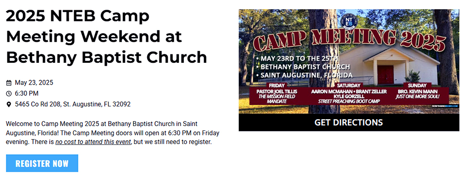 Every Sunday morning, from 10:00 AM – 12:30 PM EST, we invite you to join us live and in-person at Bethany Baptist Church here in Saint Augustine where we lift up the Lord Jesus Christ in psalms, hymns and spiritual songs, and preach a message from the pages of the King James Authorized Version Holy Bible.