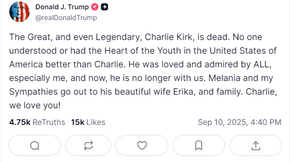 Moments ago, President Trump posted “The Great, and even Legendary, Charlie Kirk, is dead. No one understood or had the Heart of the Youth in the United States of America better than Charlie. He was loved and admired by ALL, especially me, and now, he is no longer with us. Melania and my Sympathies go out to his beautiful wife Erika, and family. Charlie, we love you!”