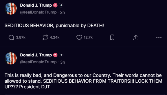President Donald Trump said that six Democratic lawmakers who put out a video urging military members to ‘refuse illegal orders’ were guilty of ‘SEDITIOUS BEHAVIOR, punishable by DEATH!’ in a stunning Thursday morning post