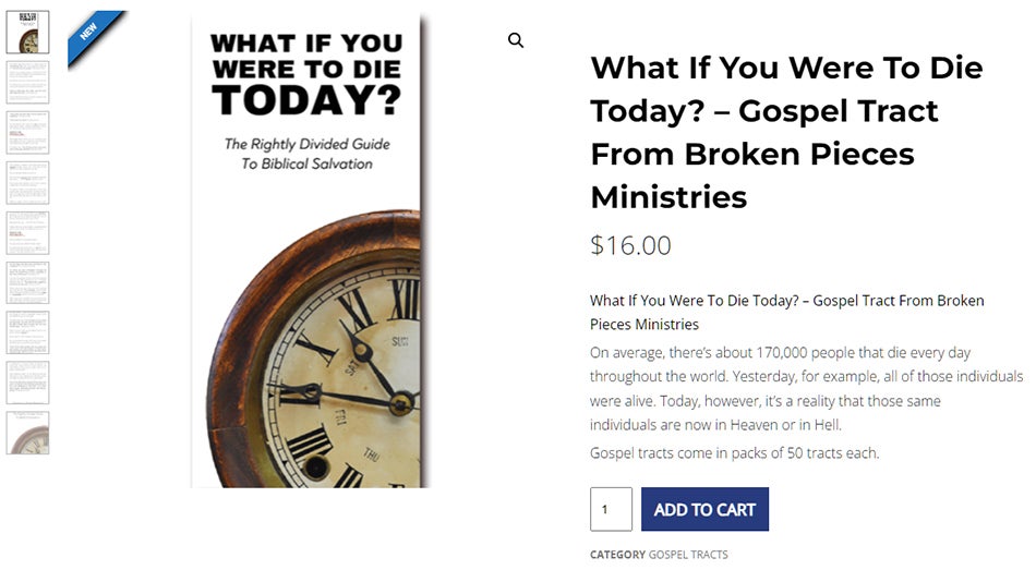 This is the official gospel tract of NTEB, used here on the streets of Saint Augustine and sent around the world as they are purchased through our website. We ask you to prayerfully consider supporting the work of Now The End Begins by purchasing a box of these full-color, high-quality gospel tracts. Thank you in advance!